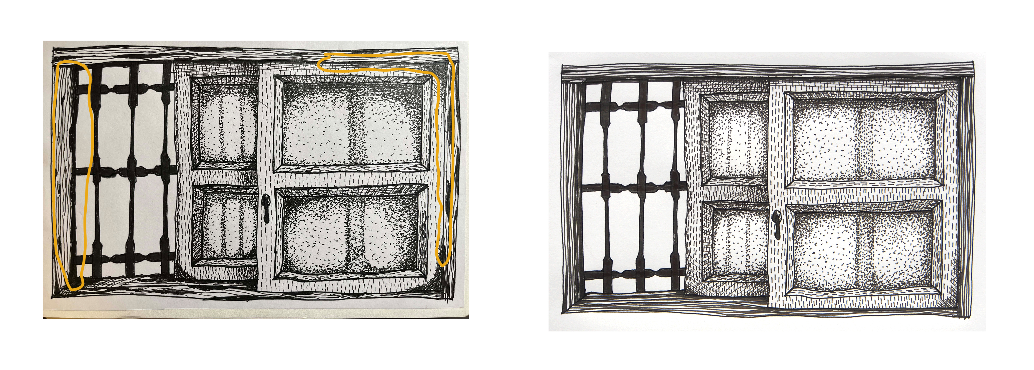 窗戶和旁邊木框的交接處可以再暗一些,這樣可以更清楚他們兩著的關係:窗戶是嵌在木框裡的,並且可以兩者的前後關係更清楚。目前少了這個處理,兩者看起來是無縫接軌,層次上也比較平。