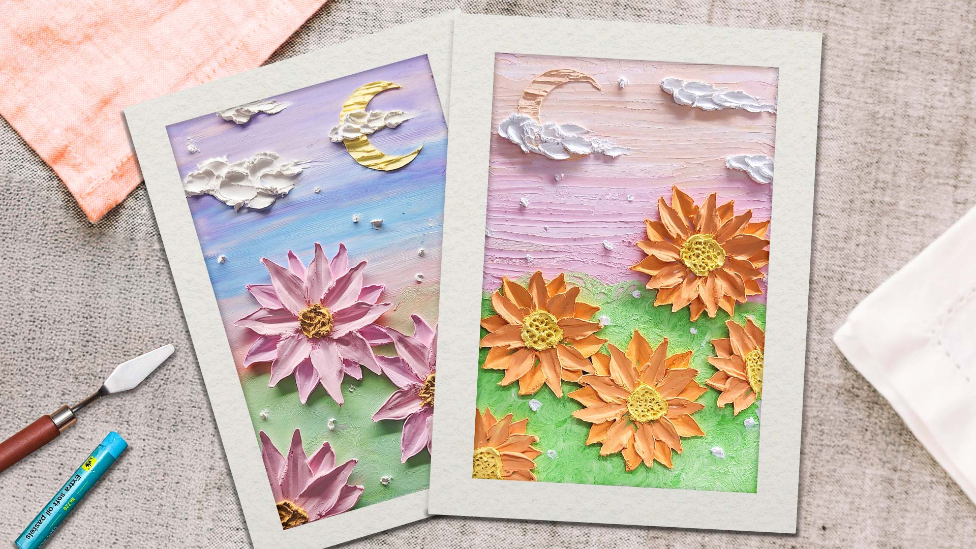 教您如何使用刮刀取色並繪製尖形花瓣及花蕊,學習自製月亮型板及入顏色並創造肌理感,練習用堆疊的方式來繪製雲朵。