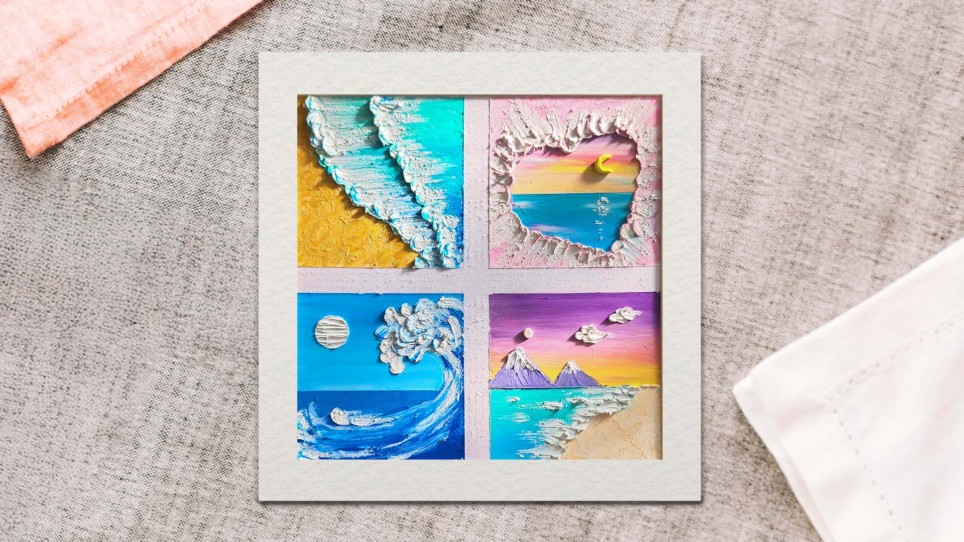 教您如何在一張畫紙上做四宮格創作, 利用平塗、混色的技法來繪製海洋,以及各種不同的海浪畫法,練習自製太陽型板並用刮刀創造肌理感,學會用手搓法製作彎彎月。