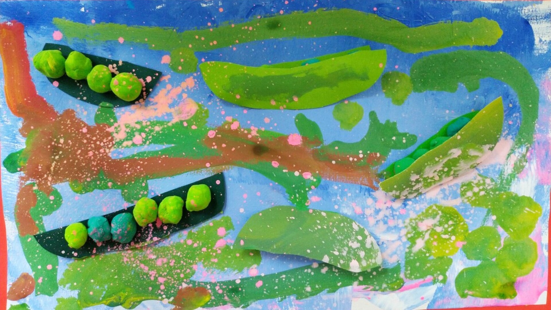 生活中常見的碗豆,利用紙張剪出豆莢、再用黏土調色,搓出一顆顆飽滿的豆子,搭配水彩畫出鮮明的背景。