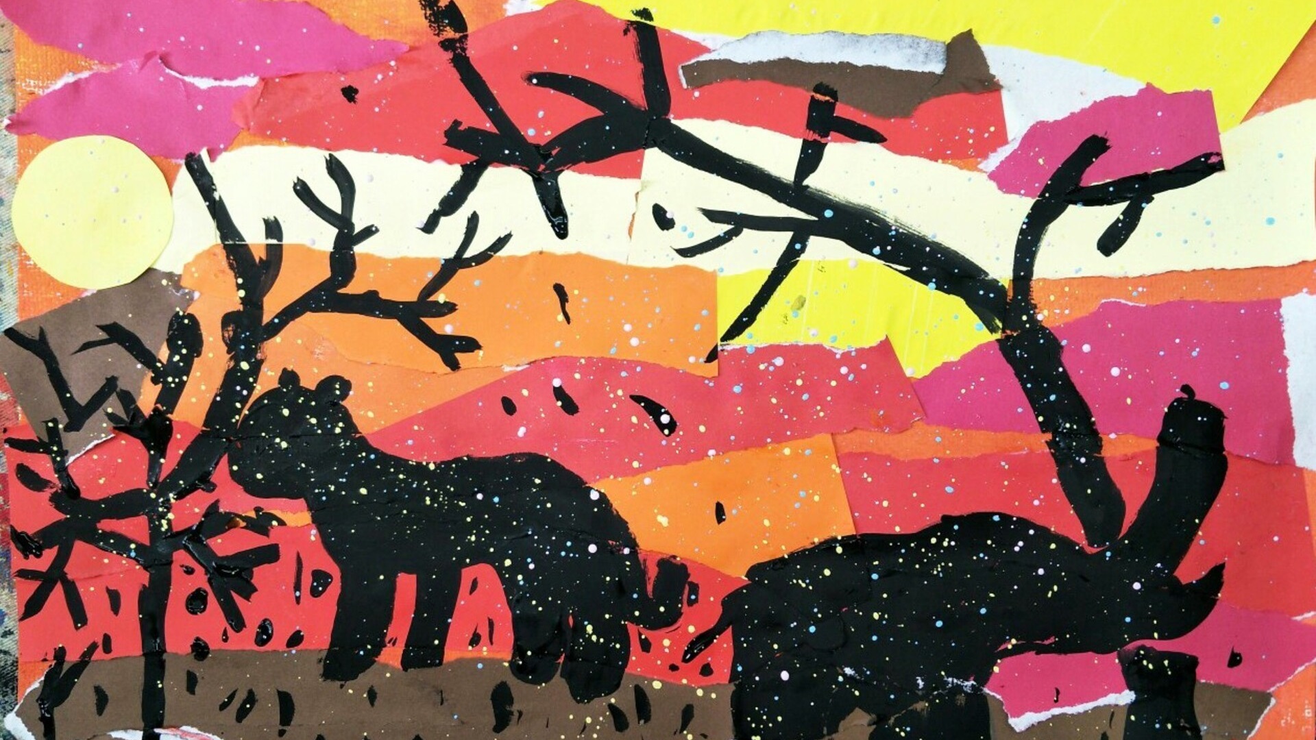 以撕貼紙張與水彩渲染出非洲夕陽景色,讓孩子創作剪影動物與樹木,學習構圖與色彩層次的表現。