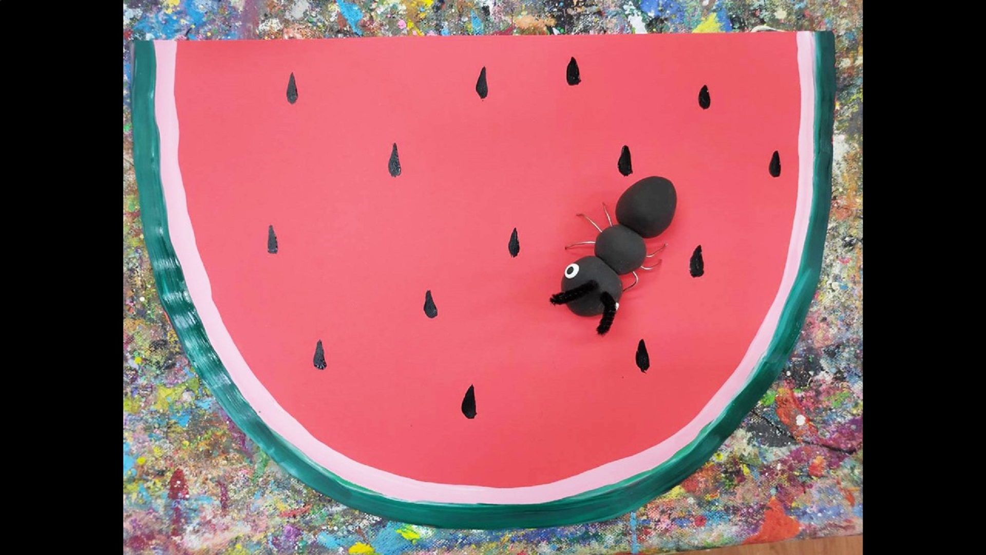 以黏土製作立體螞蟻,搭配繪製的西瓜紙藝,讓孩子體驗構圖與造型,創作逗趣的夏日美味場景。