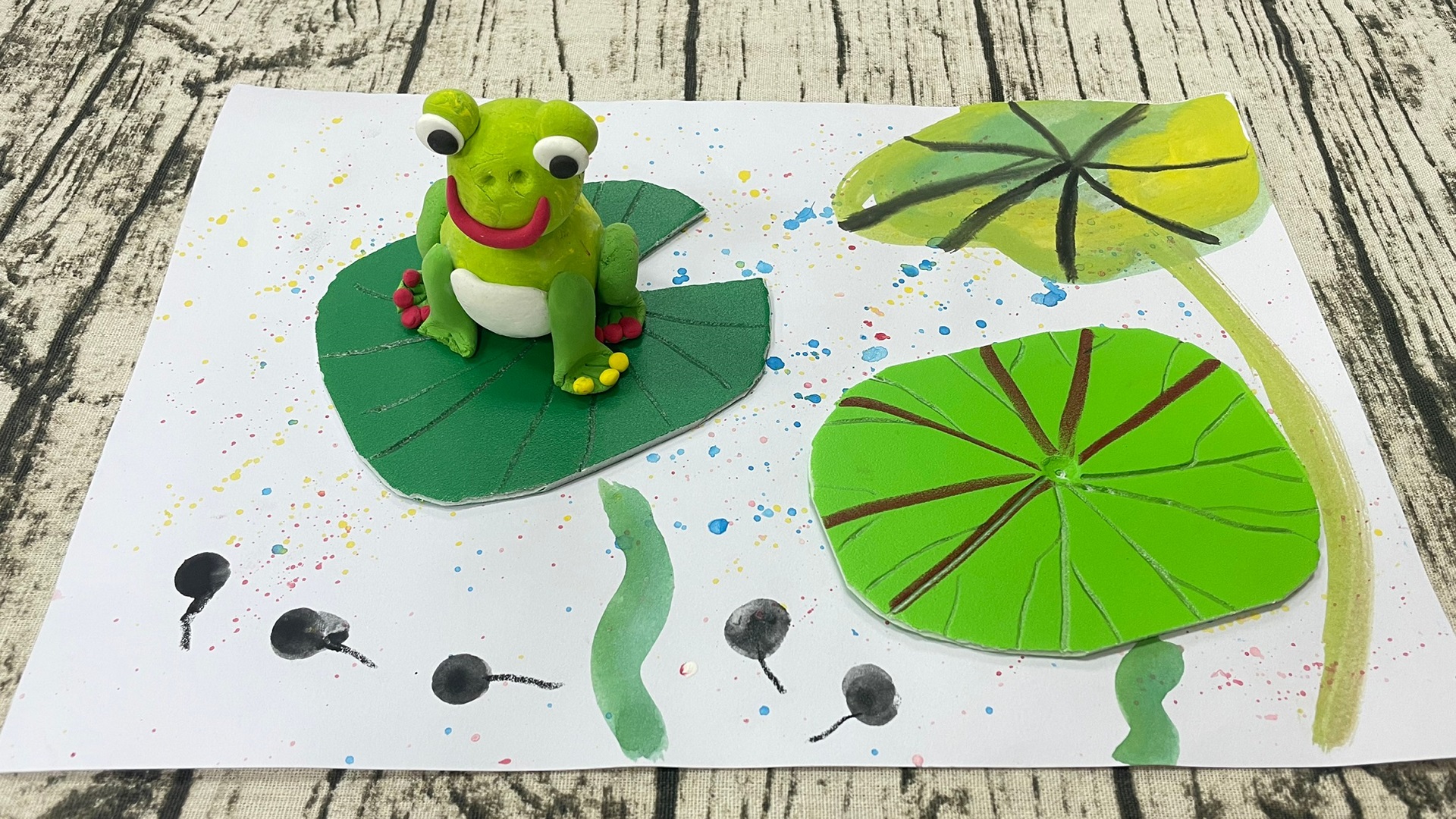 運用紙雕、水彩與黏土創作生動青蛙與池塘場景,啟發孩子觀察自然、生物特徵及立體造型的創作能力。