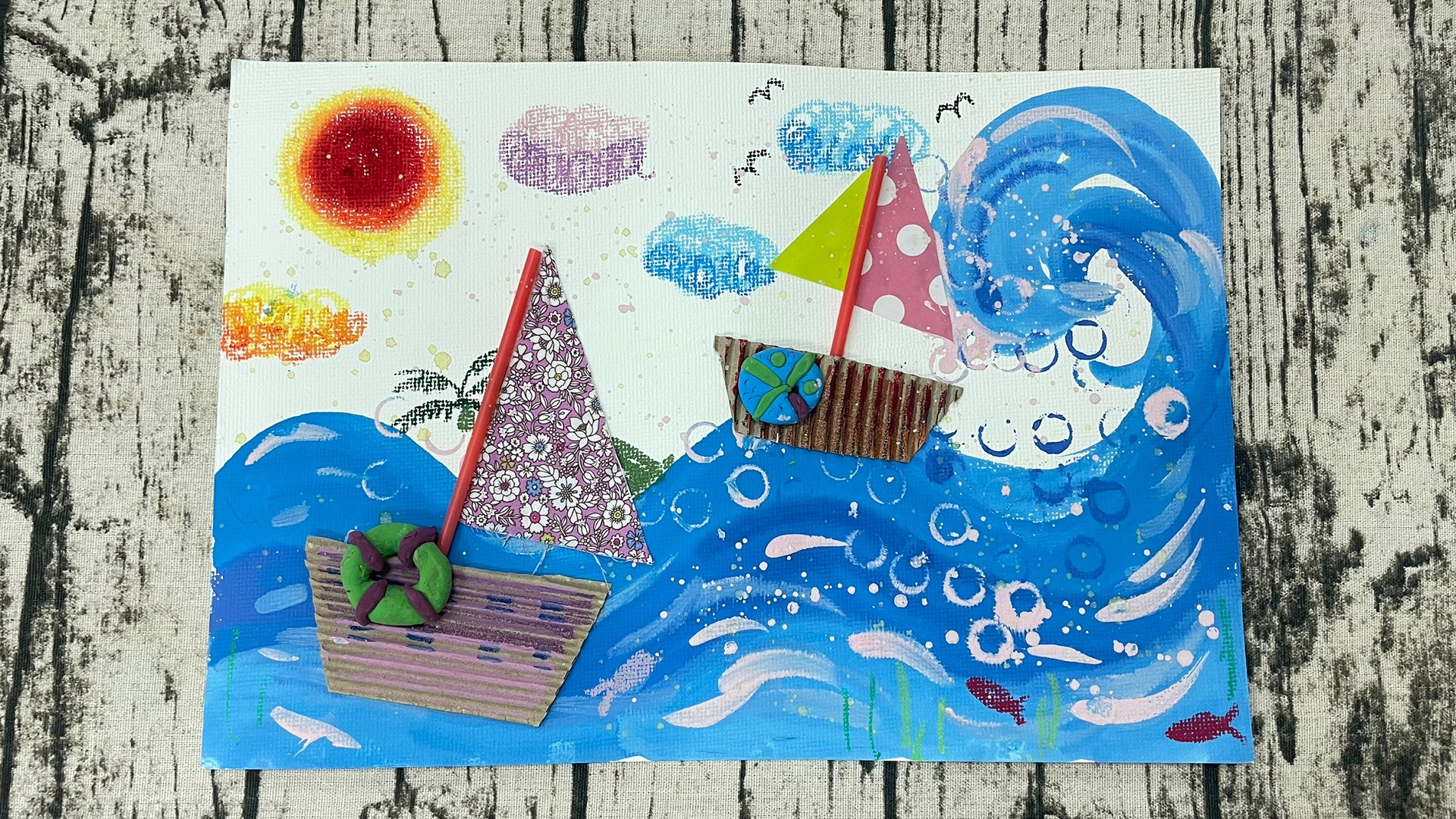 運用紙雕、黏土等複合式材料製作帆船,搭配水彩與蠟筆繪出天際與海,從多種繪材中激發孩子的空間想像與創意展現。