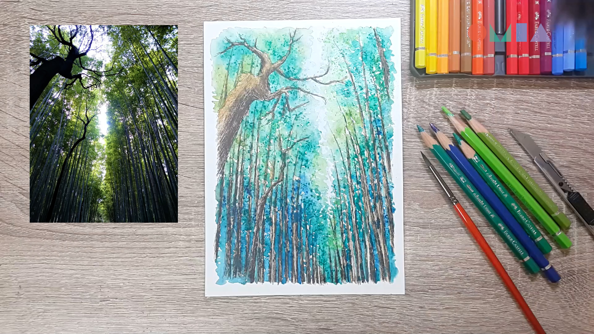學習以代針筆線條,建構樹幹的層次立體感,再輔以水性色鉛筆渲染樹林間的色彩。