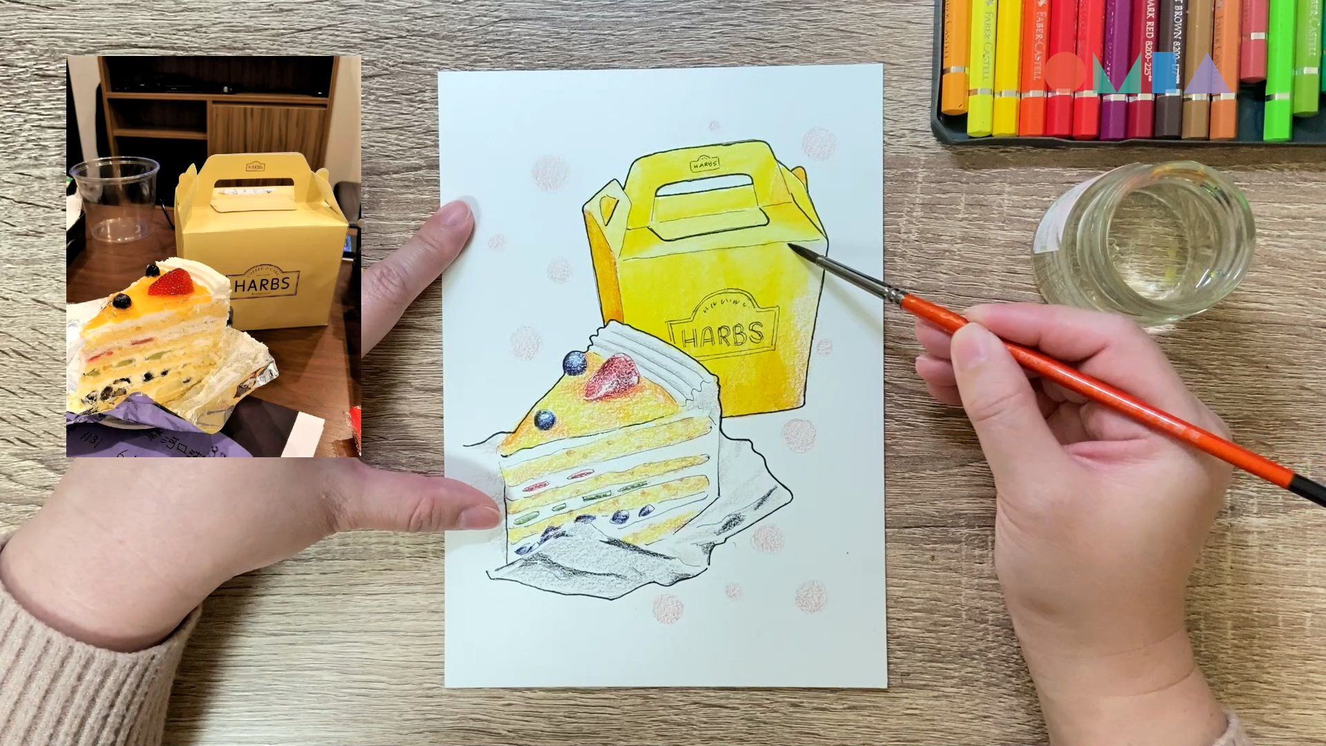 以幾何構圖法定位,代針筆的整體框架,搭配色鉛筆上色明暗呈現立體感,利用紙張紋路製造海綿蛋糕的蓬鬆質地。