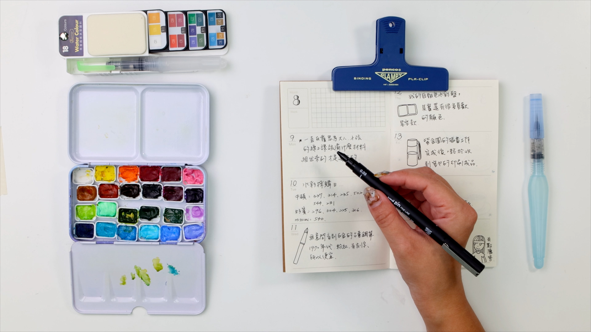 介紹慣用的手帳工具,除了寫字的中性筆、鋼筆、代針筆的筆類之外,常用水彩畫小圖點綴,偶爾也會用色鉛筆畫細節,大家可以嘗試用各種筆來畫自己喜歡的風格。