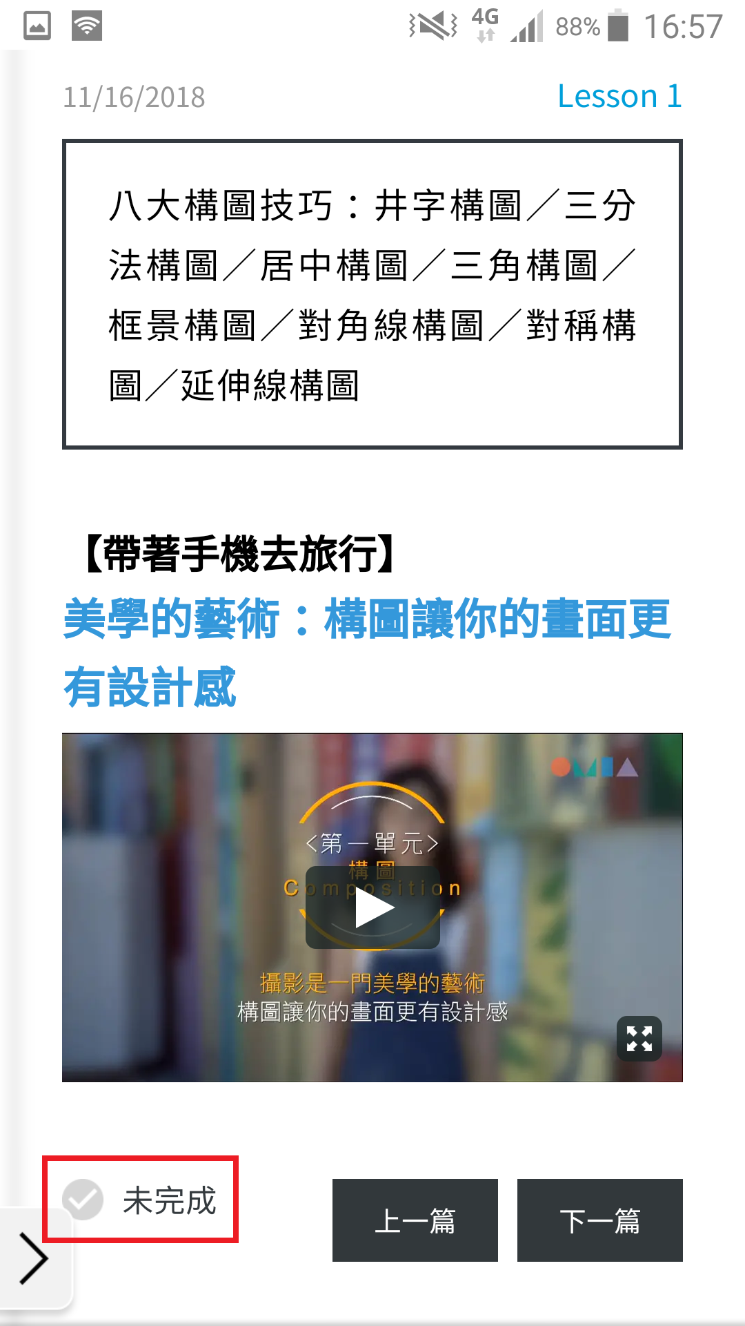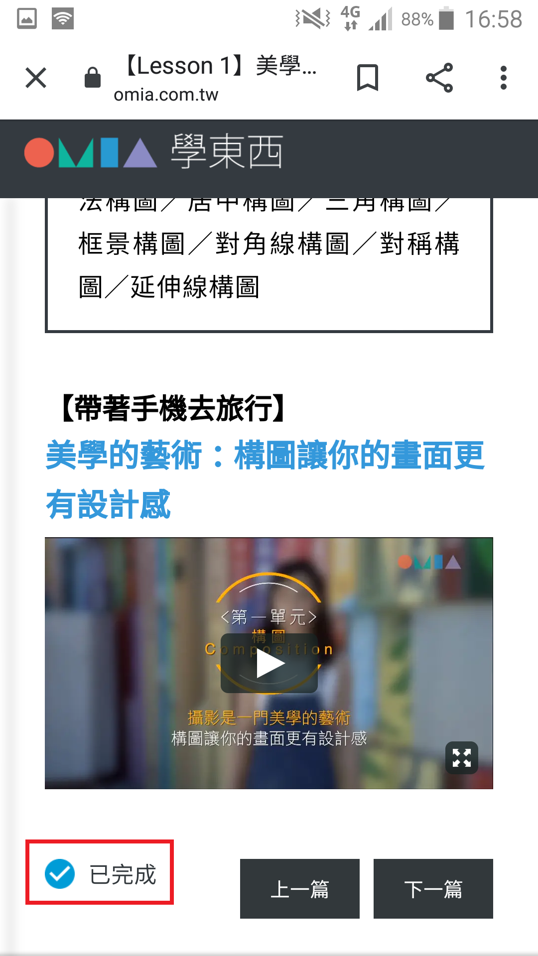 觀看完影片會自動會露出「已完成」藍勾勾;若文章內容非為影片、閱讀完該篇文章後,點選左下角「未完成」按鈕,該按鈕即會改為「已完成藍勾勾」。